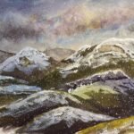 The first step was to come up with value plan, mark it out on the paper and reserve the whites. One of the good things about crystalline watercolour is that I can rub out my pencil lines until they’re almost invisible. I can still see the lines when masking out highlights or painting over darks: this is the benefit of the midtones being the last step.