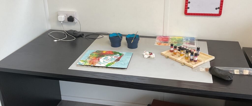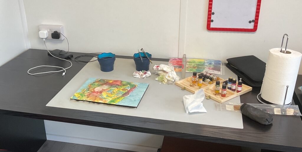 Next it’s the darks. I wanted things to be quite bright today, so sprinkled over pyrole (sic) red, orange, buttercup, leaf green, pthalo blue (GS) and quonacridone (sic) magenta and then painted over the marks. I tried to get them to mix by applying lots of water in lots of random places and trying not to brush one colour into another. As you can see, the crystals decided today to come through with lots of greens and reds.