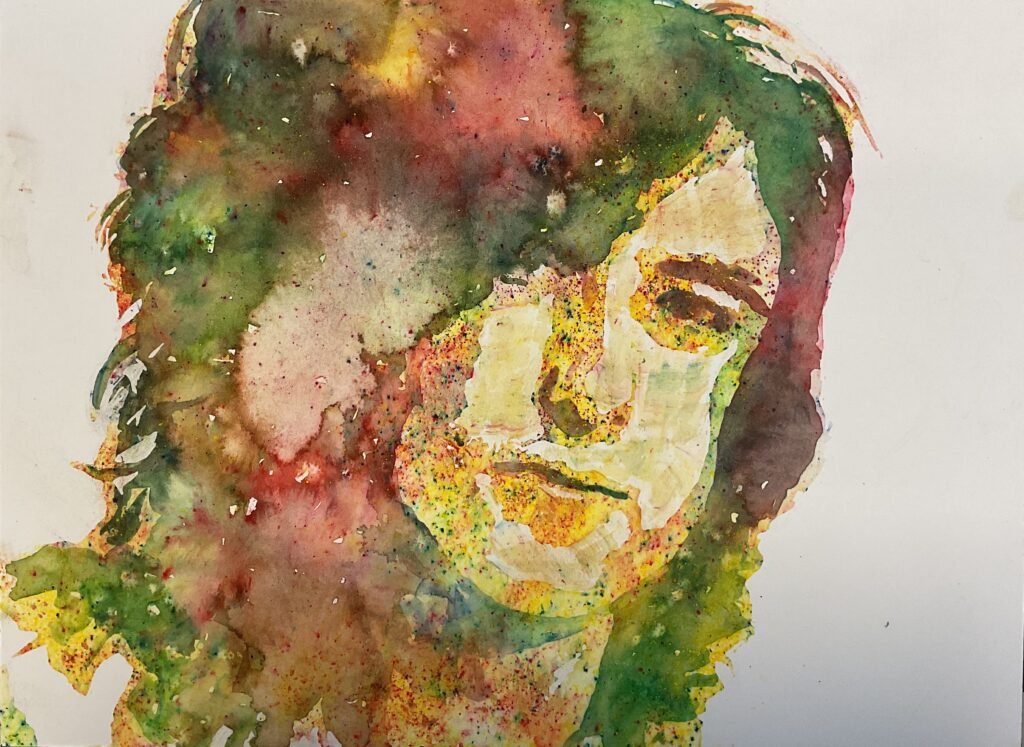 But, you know, these paintings are never over until I’ve removed all the masking fluid. And, once I’d done that, I felt better about the painting. The lighter patch in the hair and the cauliflowers everywhere just added to the impression that everything had all been thrown at the paper randomly and that an image had emerged by accident. If anything, I was slightly disappointed by the eyes and wishing that the darks indicating the nose and mouth had been darker. Still, I thought Jimmy was good enough to go up for sale.