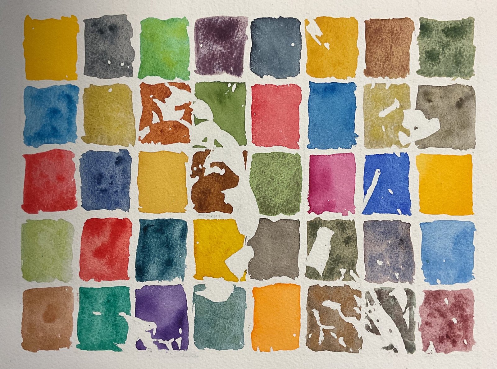 The plan was to stop there but I decided to carry on and earn myself a relaxing day tomorrow watching the chess. So I masked out all the highlights. Then I also masked out, very roughly, the grid of boundaries around my rectangles. Once that was dry, I filled out the 40 rectangles with all of the colours in my three palettes except for the MGraham burnt umber. One of my 41 colours had to miss out so I went for the one that I have two very similar versions of. There are two cerulean blue rectangles in there but MGraham’s and Winsor & Newton’s cerulean blues are based on different pigments, so I’m happy to give them both a place. In filling out the rectangles, I tried not to fill them right up to the masked out edges except for wherever there were negative, masked out shapes touching the edges. When the watercolours were dry, I removed the making fluid and rubbed out any visible pencil lines. And that was me done.