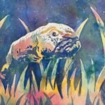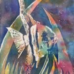 I followed my usual process for posterised paintings, but also included the starry masking fluid spatters in the background, something that I seem to do every time at the moment. This was one of those paintings, though, that didn’t come out perfectly and needed some tinkering. The right side of Rik’s face, while faithful to my source photo, looked too wide compared to his chin, so I added more mid and darktones to narrow it. And that big shape on his right shoulder had too much white in it, so I added more of the light tones to it. And that was me done.