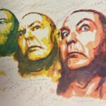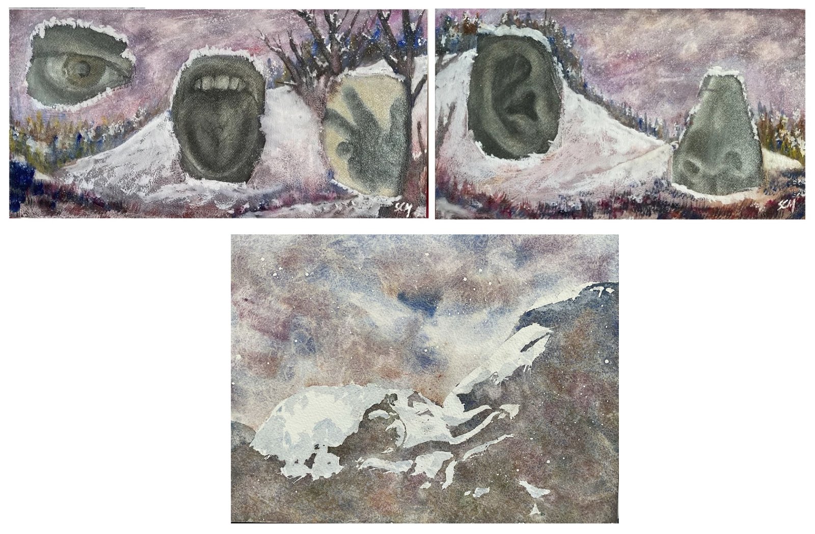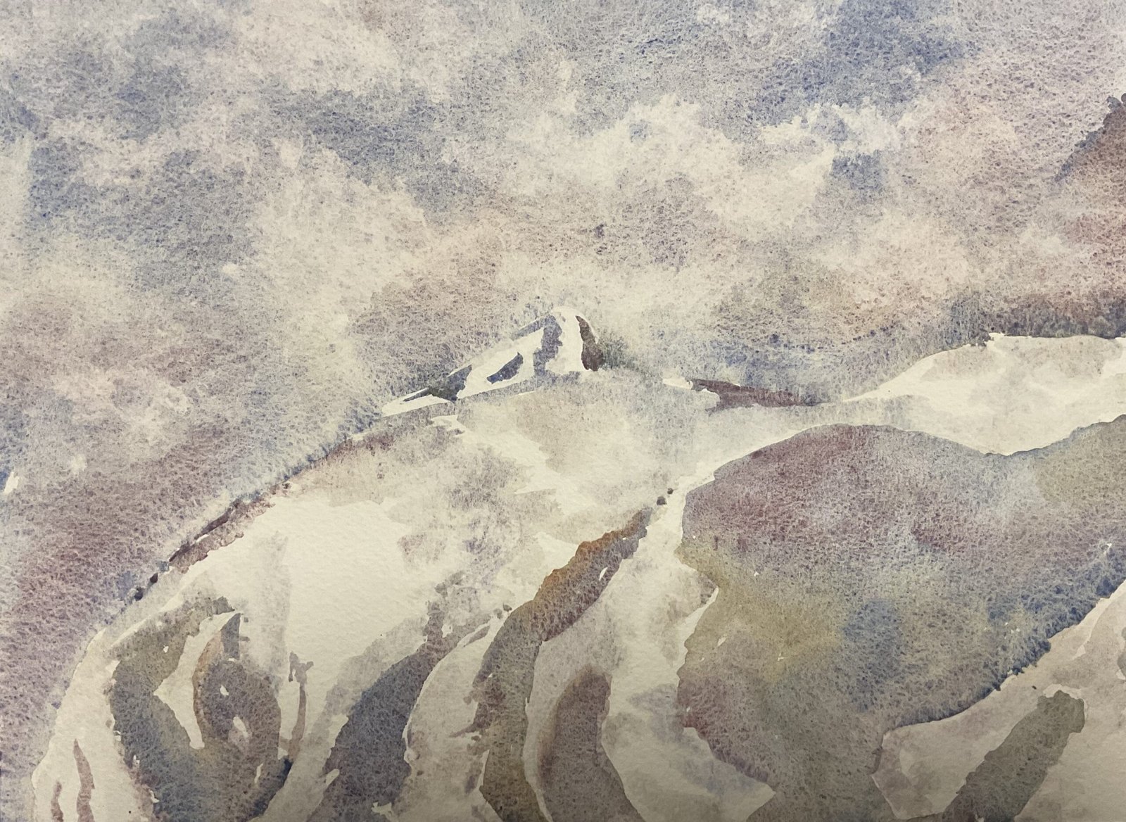 After a sleep and a walk, I decided that yesterday’s painting wasn’t going to be next year’s official portrait me Portrait Artist Of The Year Entry. It was the third time I’d painted faces hidden in mountain landscapes but the first time Iād done this with limited use of masking fluid. And somehow, doing away with the masking fluid and having to take more care over my dark shapes clanged my painting style and the results. I thought it looked like a statue of me carved in ice and someone on LinkedIn (hi Iain!) thought it looked like a limestone statue. Either way, it looked more like a statue than a mountain, so it seemed weird to have only half the face showing. So today I painted the full head in the some pose and same style but with the intention of creating a portrait and not a landscape.