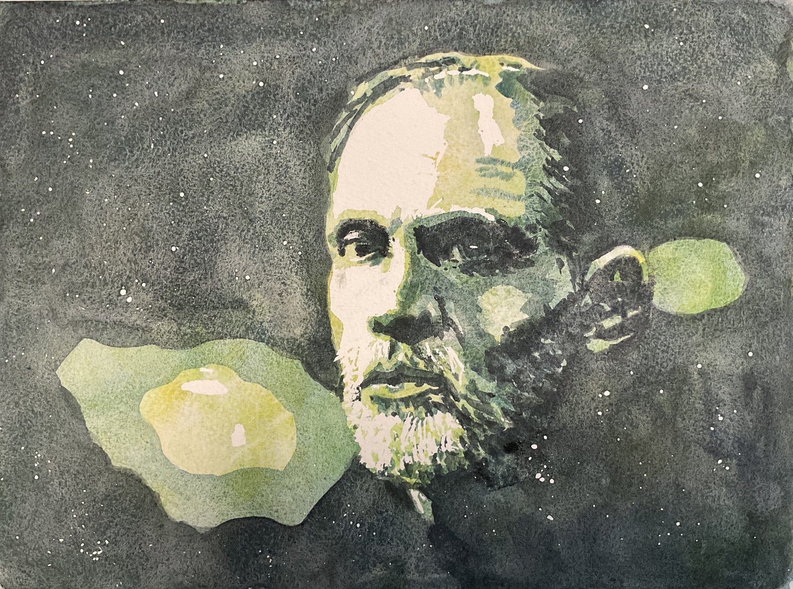 I started by following my usual process for posterised paintings. But when the masking fluid came off I wasn’t happy with the likeness. Closer examination, and dropping imaginary lines tyres of the eyes to where I was supposed to have features of the nose and mouth, revealed a lot of errors that had crept in during the painting as a result of my pencil outlines of the dark areas not having been visible in many places. The corrective actions I had to make included rewetting and lifting off bits of Shire grey from the darks and from the shadow under the nose in particular.